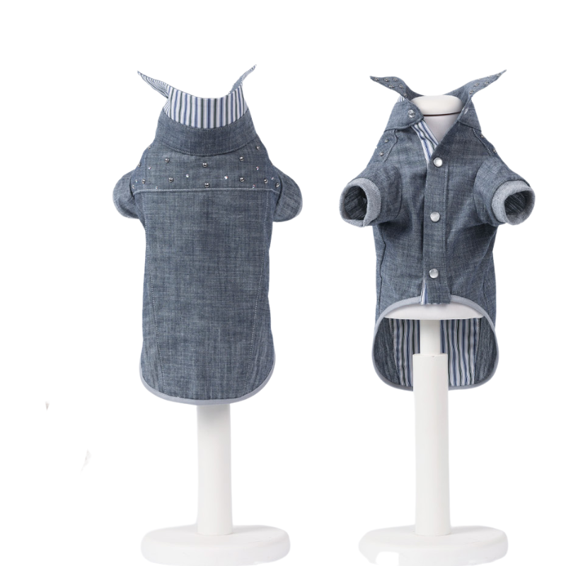 Camicia jeans impunturata, manica cota con polsino di costina di cotone e rifinita con borchiette su sprone e colletto.