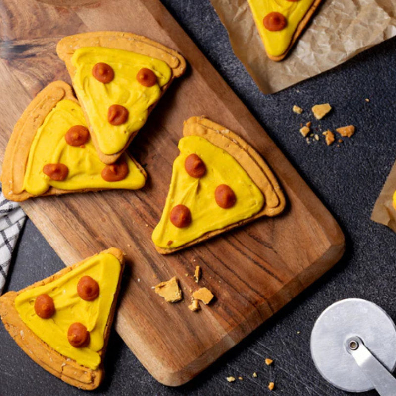 Ogni fetta di pizza per cani è un piccolo capolavoro di pasticceria canina. La base è costituita da un biscotto croccante al burro di arachidi, cotto a mano per ottenere una consistenza dorata e irresistibile che stimola la masticazione. La farcitura è realizzata con una glassa setosa a base vegetale, totalmente priva di zucchero, e colorata naturalmente con barbabietola.