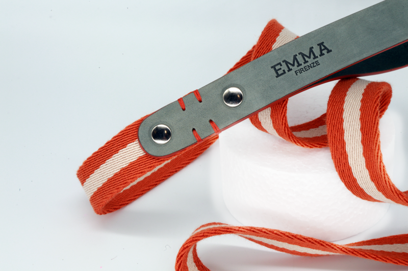Realizzato in nabuk e nastro di tessuto, cuciture fatte a mano, metalleria nichel lucida a telaio. Timbro logo a caldo. Made in Italy
