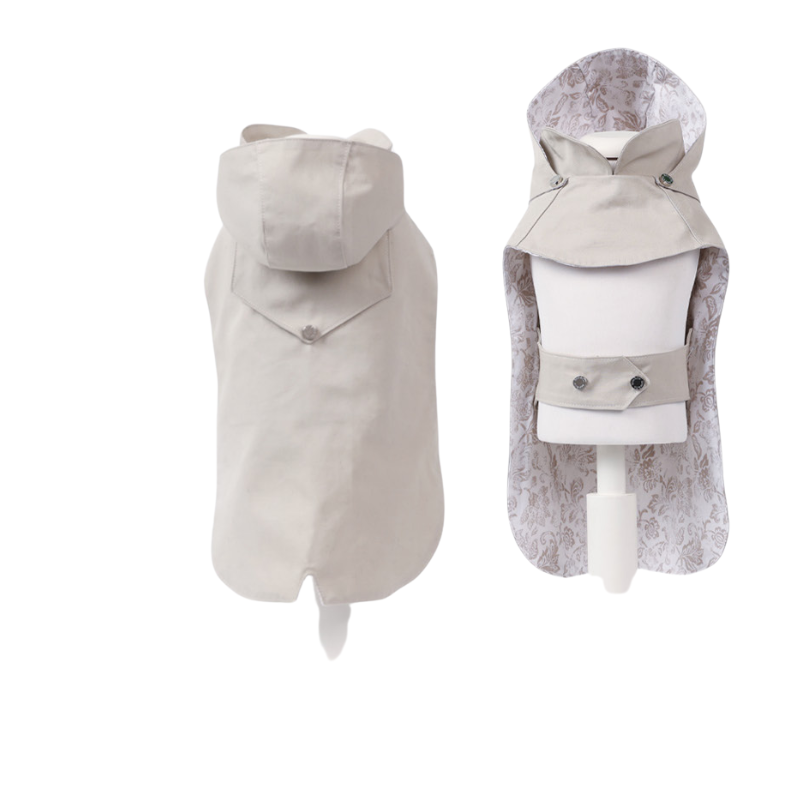 Pratico ed elegante impermeabile in gabardina di cotone con trattamento antigoccia, cappuccio staccabile, chiusura regolabile e asola nascosta per il passaggio del guinzaglio.