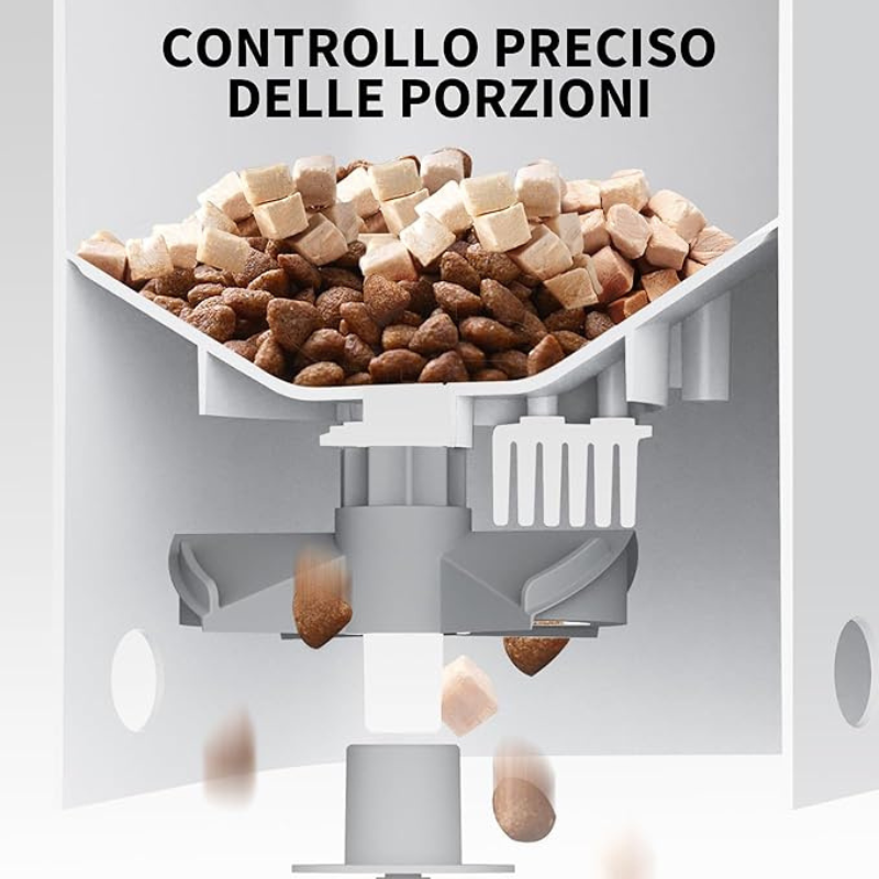 - Massima Freschezza e Design Anti-Intasamento: Dotata di guarnizioni ermetiche, un essiccante integrato e un’uscita chiusa, mantiene il cibo fresco e asciutto. Il design anti-intasamento gestisce crocchette fino a 12 mm senza problemi.