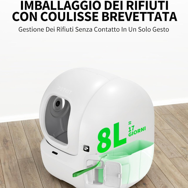 - Gestione Igienica e Senza Contatto dei Rifiuti: Grazie al sistema brevettato di chiusura automatica, gestire i rifiuti non è mai stato così facile e pulito. Basta aprire il coperchio e tirare il sacchetto: tutto è confezionato in modo igienico. Il cestino da 8L consente fino a 15 giorni di utilizzo senza svuotamento per un gatto, ideale per chi viaggia spesso.